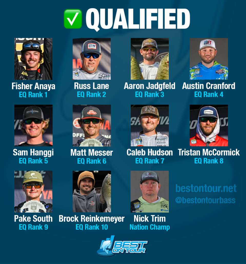 Russ Lane is the only angler on the “Qualified” list who is not an Elite Series rookie for 2026. He competed on the Elites previously, from its inception in 2006 until 2018, during which he qualified for 7 Bassmaster Classics. In 2019 he went to Major League Fishing’s Bass Pro Tour. He fished the Bassmaster Opens in 2024 and 2025 (+ the EQs) and requalified by finishing 2nd in the EQs.
